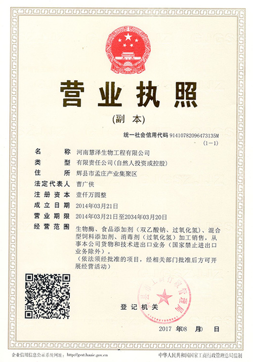 鄭州慧澤生化科技有限公司是一家充滿朝氣的科研生產型高技術企業。目前公司業務主要集中在精細化工、食品化工和微生物制劑行業。公司現已建成鄭州、焦作、新鄉三個生產基地,其中河南新鄉輝縣孟莊生產基地占地70畝,總投資達1.2億。現擁有年產100000噸過氧化氫消毒劑,年產8000噸的過氧化鈣和年產5000噸的雙乙酸鈉的生產線,同時開設有生產總量5000噸的枯草芽孢桿菌、地衣芽孢桿菌等微生態制劑發酵生產車間。公司始終堅持“以人為本,科技興企,品質優良,用戶滿意”的經營宗旨。為客戶創造價值更多的價值...